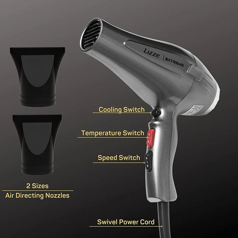 سشوار حرفهای 2400 وات لیز مدل EXTREMEW، موتور AC، وزن 480 گرم، المنت فلز، دارای سری متمرکزکننده باریک، متمرکزکننده پهن با ویژگی فرکنندگی، صافکنندگی، حجمدهندگی، با قابلیت تنظیم دما، باد سرد، فناوری تولید یون