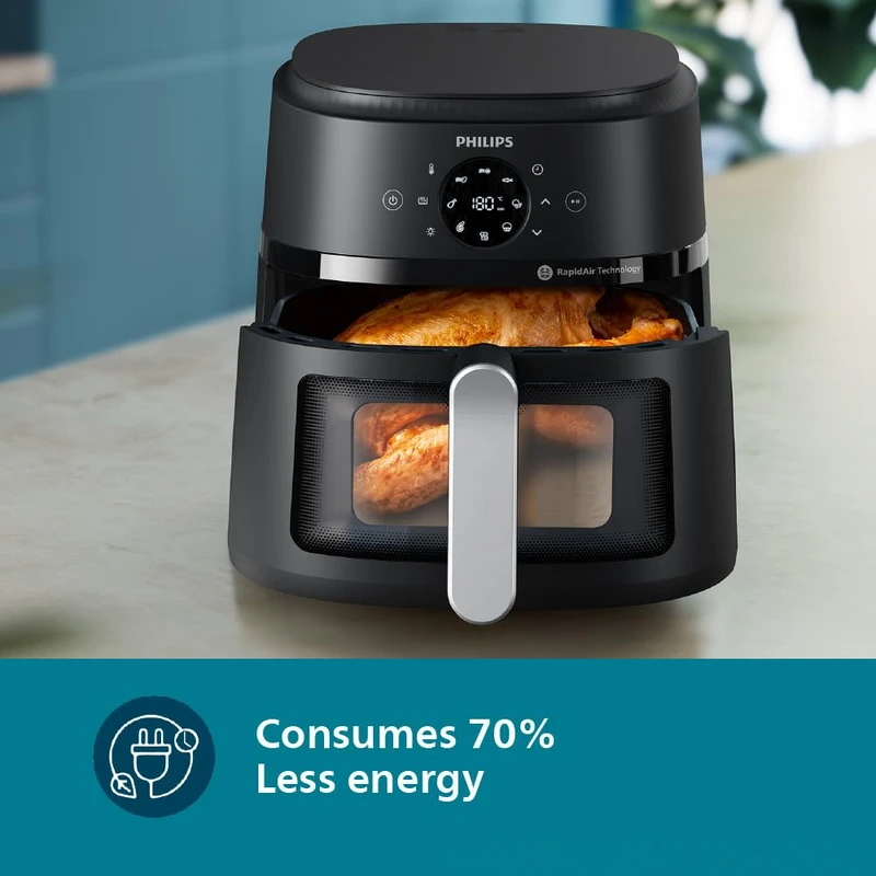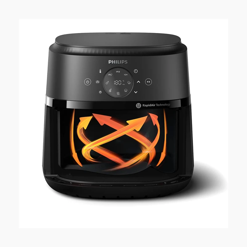 قلب تپندهی عملکرد بینظیر این سرخکن، فناوری انحصاری Rapid Air فیلیپس است. این تکنولوژی پیشرفته، با استفاده از یک المنت حرارتی قدرتمند ۱۷۰۰ واتی و یک فن با طراحی خاص که هوای داغ را با سرعت بسیار زیاد و به شکلی گردابی و ستارهای شکل در اطراف مواد غذایی به گردش درمیآورد، پختی کامل، یکنواخت و سریع را تضمین میکند. نتیجهی این گردش هوای ۳۶۰ درجه، ایجاد یک لایهی بیرونی فوقالعاده ترد و طلایی، و در عین حال، حفظ رطوبت و آبدار بودن بخش داخلی مواد غذایی است؛ آن هم با کاهش مصرف روغن تا ۹۰ درصد نسبت به روشهای سرخ کردن سنتی. نکتهی قابل توجه دیگر در این مدل، "طراحی منحصربهفرد برای پخت یکنواخت حتی بدون برگرداندن غذا" است. این طراحی هوشمندانهی داخلی سبد و جریان هوا، تضمین میکند که حرارت به طور یکسان به تمام نقاط مادهی غذایی برسد و دیگر نیازی به هم زدن یا برگرداندن مداوم غذا برای پخت یکدست نباشد. این ویژگی، راحتی و صرفهجویی در زمان را برای کاربر به همراه دارد.